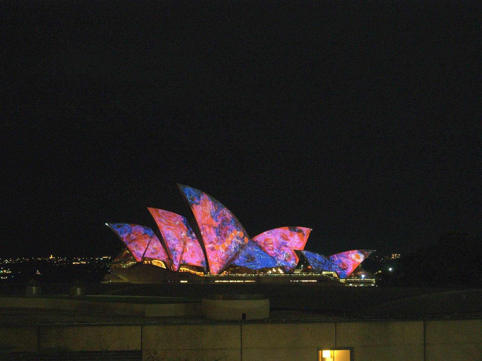 However, VIVID was going on while we were there. What is VIVID? It's a festival of lights, music, and ideas. Here's a pictures of what the opera house looked like at night: