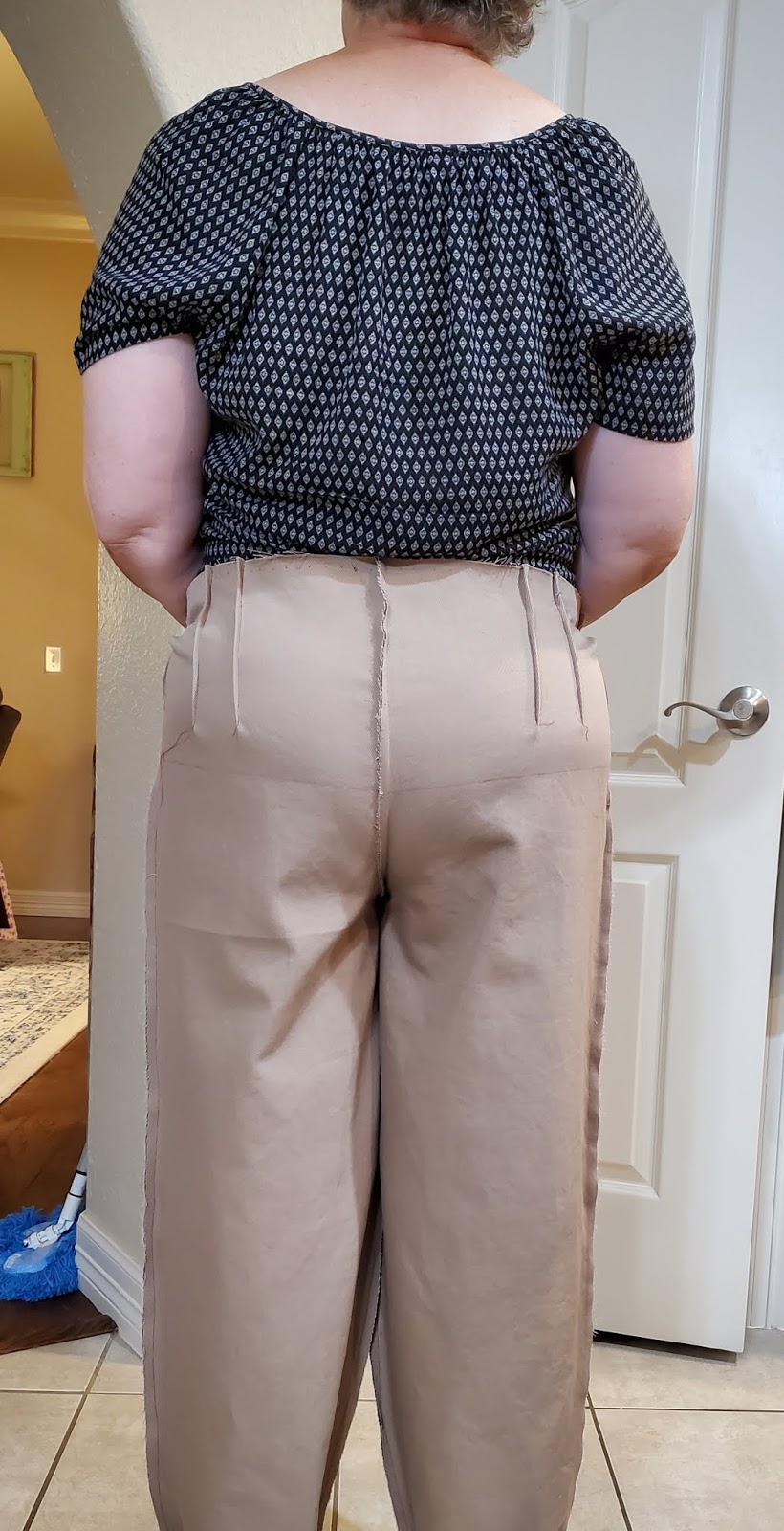 The changes here are the release of the darts. This made it much easier to pin the pants closed. I also put a little tuck across the front. You can see in the first picture that the fabric was being pushed into this position. The tuck does move around to the back but it is very small. I think I need to add a little dart in the curved area under the belly to remove those wrinkles.